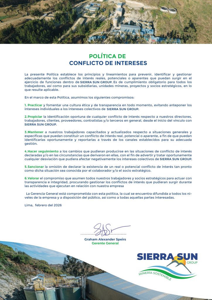 POLITICA DE CONFLICTO DE INTERESES En SIERRA SUN GROUP hemos definido nuestra POLITICAS EMPRESARIALES CORPORATIVAS en base a la protección de la vida y salud de los trabajadores y contratistas; en el cuidado del medio ambiente, en la convivencia armónica y respetuosa con nuestros vecinos y nuestros colaboradores, así como la transparencia en todos nuestros […]